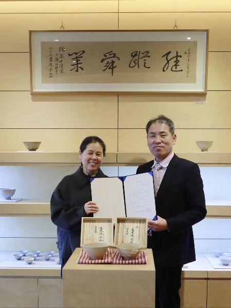 김상현 오킨스전자 부사장과 천경희 도천도자미술관 대표가 도자 작품 기증식 및 자매결연식 이후 기념촬영을 하고 있다. 기증된 작품은 정호찻사발 2점이다 /사진제공=오킨스전자 |