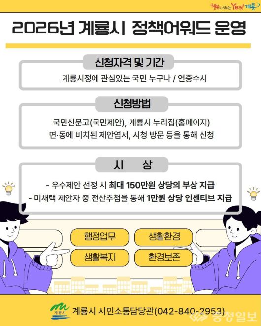 충남 계룡시는 '2026 계룡시 정책 어워드(AWARD)'를 연중 운영한다. 시민이 직접 정책을 제안하고, 그 과정에 참여할 수 있도록 설계된 제도로, 시민 중심의 행정과 공감 가능한 행정서비스 구현을 목표로 한다.