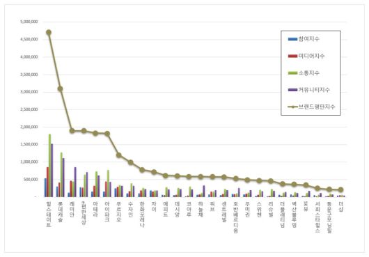 3위 래미안 브랜드는 참여지수 131,097, 미디어지수 463,185, 소통지수 442,947, 커뮤니티지수 859,240으로 브랜드평판지수 1,896,469를 기록했다. 이는 지난 12월과 비교해 32.70% 하락한 수치다.