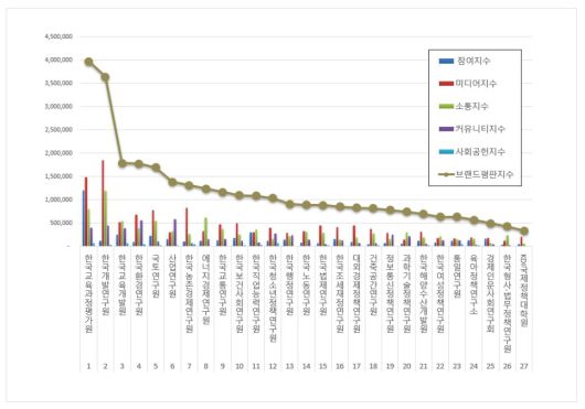 2위 한국개발연구원 브랜드는 참여지수 120,928, 미디어지수 1,851,100, 소통지수 1,189,225, 커뮤니티지수 444,579, 사회공헌지수 33,896으로 브랜드평판지수 3,639,728로 분석됐다. 지난 12월 대비 22.71% 하락했다.
