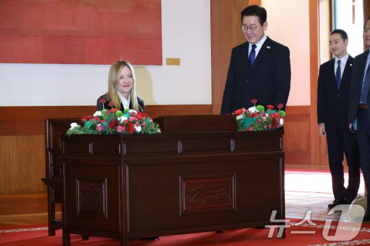 (서울=뉴스1) 이재명 기자 = 이재명 대통령이 19일 청와대에서 조르자 멜로니 이탈리아 총리의 방명록 작성을 보고 있다. 2026.1.19/뉴스1