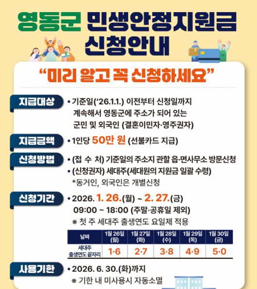 충북 영동군 오는 26일부터 군민 1인당 50만원 민생안정지원금 지급 안내 포스터./영동군 |