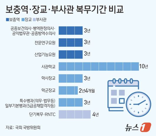 올 4월이면 전체 공중보건의사(공보의) 38%가 복무를 마치는 가운데, 이들 복무기간을 현행 36개월에서 24개월로 줄여 안정적인 수급과 의료 취약지 주민의 건강권을 보장해야 한다는 목소리가 커지고 있다. 보충역·장교·부사관 복무기간 비교. ⓒ News1 김초희 디자이너 |