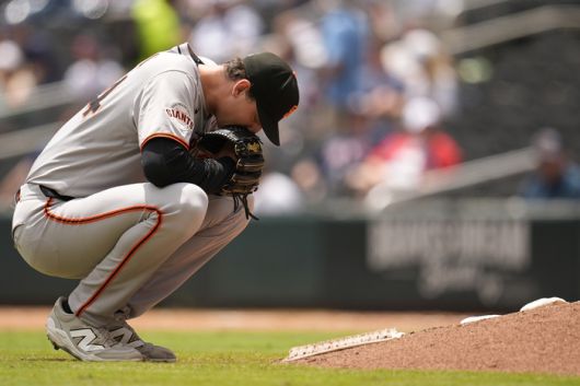 샌프란시스코 션 젤리가 23일(현지시간) 미국 애틀랜타에서 열린 애틀랜타전에서 7회 투구에 앞서 잠시 숨을 고르고 있다. 사진 | 애틀랜타=AFP연합뉴스 |