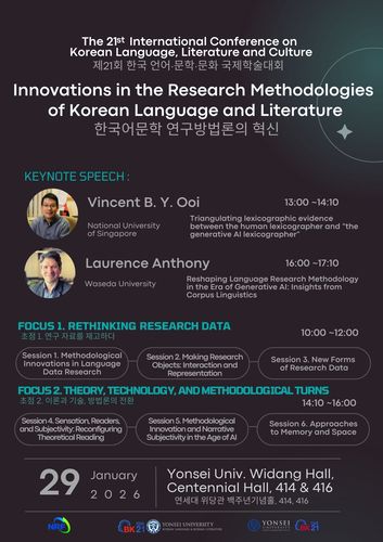 오후 세션은 '이론과 기술, 방법론의 전환'을 주제로 두 편의 기조강연이 이어진다. 강연에서는 생성형 AI 시대에 말뭉치 언어학과 사전학이 직면한 변화와 과제를 집중적으로 조망하고, 디지털 인문학의 최신 쟁점들을 이론적으로 분석한다.