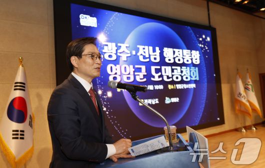 (영암=뉴스1) 김태성 기자 = 우승희 영암군수가 19일 전남 영암군 청소년센터에서 열린 '광주전남 행정통합 도민공청회'에서 인사말을 하고 있다. 도민공청회는 영암을 시작으로 22개 시군을 돌며 실시한다. 2026.1.19/뉴스1
