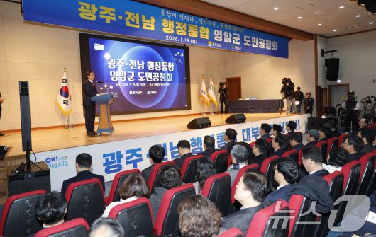 (영암=뉴스1) 김태성 기자 = 우승희 영암군수가 19일 전남 영암군 청소년센터에서 열린 '광주전남 행정통합 도민공청회'에서 인사말을 하고 있다. 도민공청회는 영암을 시작으로 22개 시군을 돌며 실시한다. 2026.1.19/뉴스1hancut01@news1.krCopyright ⓒ 뉴스1. All rights reserved. 무단 전재 및 재배포, AI학습 이용 금지.