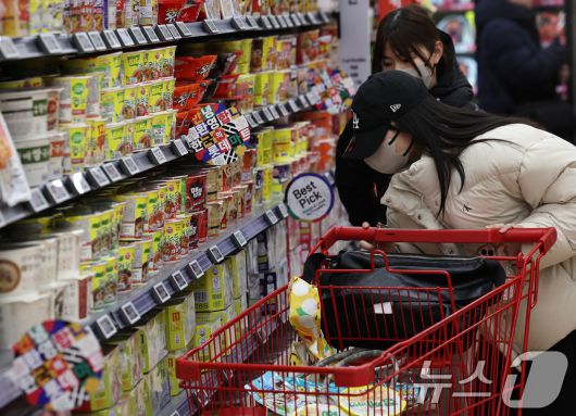 서울의 한 대형마트에서 외국인 관광객들이 라면을 구입하고 있다. ⓒ News1 구윤성 기자 |