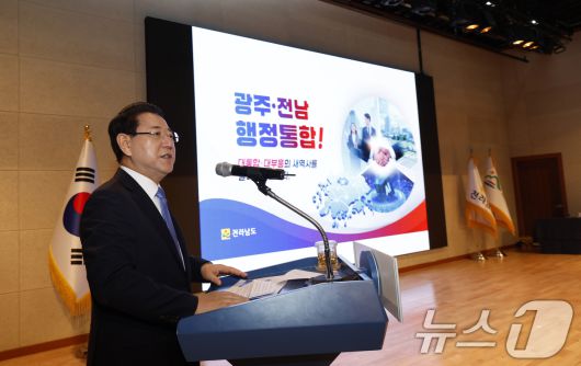 (영암=뉴스1) 김태성 기자 = 김영록 전남도지사가 19일 전남 영암군 청소년센터에서 열린 '광주전남 행정통합 도민공청회'에서 행정통합 추진방향에 대해 설명하고 있다. 도민공청회는 영암을 시작으로 22개시군을 돌며 실시한다. 2026.1.19/뉴스1
