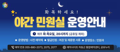 하동군은 기존 화요일에만 운영하던 야간 민원실을 2026년부터 목요일까지 확대한다고 밝혔다.