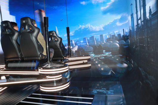울산박물관 1층에서 1m 높이에 떠 있는 모의장치인 ‘울산 라이징 포트’를 타고 울산 미래산업단지를 체험하고 있는 모습 [울산시 제공] |