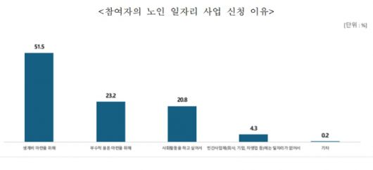 노인 일자리 사업 신청 이유는 경제적 이유가 74.7%로 가장 큰 비중을 차지했다. 이 중 생계비 마련이 51.5%, 부수적 용돈 마련이 23.2%였다. 나머지 34.7%는 노인 일자리가 '가족에게 도움이 되는 일로서 의미를 가진다'고 응답했다.