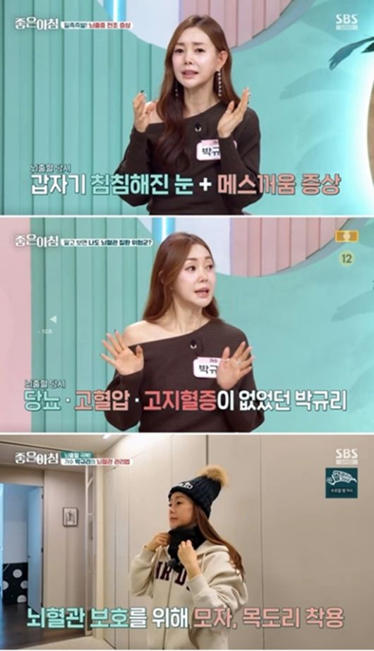 먼저 박규리는 '뇌졸중 전조 증상'에 대해 이야기 나누던 중, "30대에 뇌출혈이 와서 정말 죽을 뻔했다. 다행히 전조 증상을 느끼고 바로 병원에 간 덕분에 구사일생했다"라고 밝혀 시선을 사로잡았다.