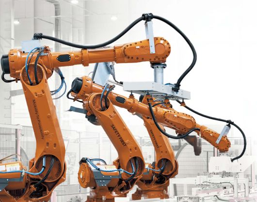 현대엘리베이터 충주 스마트캠퍼스의 제1공장에서 엘리베이터 외장재를 만드는 로봇팔 [현대엘리베이터 제공] |