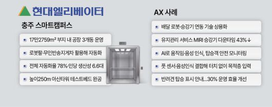 2022년 현대엘리베이터의 ‘충주 시대’를 연 스마트캠퍼스는 생산을 비롯해 연구개발(R&D)과 인공지능 전환(AX)의 주축이 되는 공간이다. 국내 최대 높이의 엘리베이터 테스트타워인 현대 아산타워에는 세계에서 가장 빠른 분속 1260m급 엘리베이터가 운영되며 기술 개발을 이어가고 있다. 현대엘리베이터는 이곳에서 생산, 상품 개발, 승강기 관리 전 과정에 인공지능(AI)을 도입하며 기술 고도화에 박차를 가하고 있다.