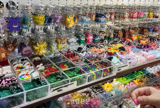 평일 오후인데도 동대문종합시장 5층 액세서리 부자재 구역 통로는 사람들로 꽉 차 움직이기조차 어려웠다. 좁은 틈을 비집고 들어서자 색색의 볼펜 몸통이 빼곡히 진열된 매대가 눈에 들어왔다. 옆에는 캐릭터 비즈, 컬러 참, 미니 피겨 등 수십 가지 참과 파츠(장식 부품)가 가지런히 놓여 있었다.