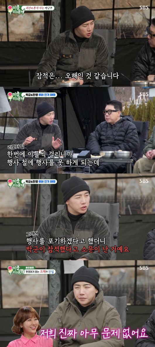 지난 18일 방송된 ‘미운 우리 새끼’에서는 괴산에서 텐트 생활을 하고 있는 박군의 일상이 공개됐다. 깊은 산속에서 홀로 지내는 모습이 비춰지자, 이를 걱정한 이상민과 임원희가 직접 박군을 찾아 나섰다.