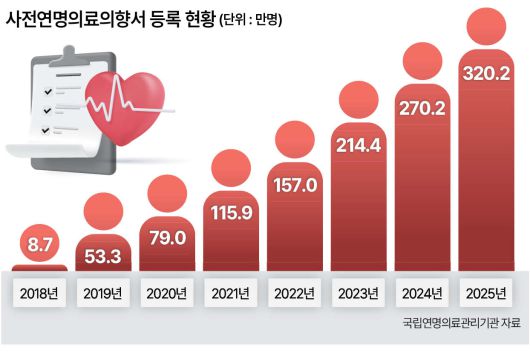 생애 말기에 연명의료(연명치료)를 받지 않고 존엄한 죽음을 택하겠다고 사전에 서약한 사람이 지난해 320만명을 넘어섰다.