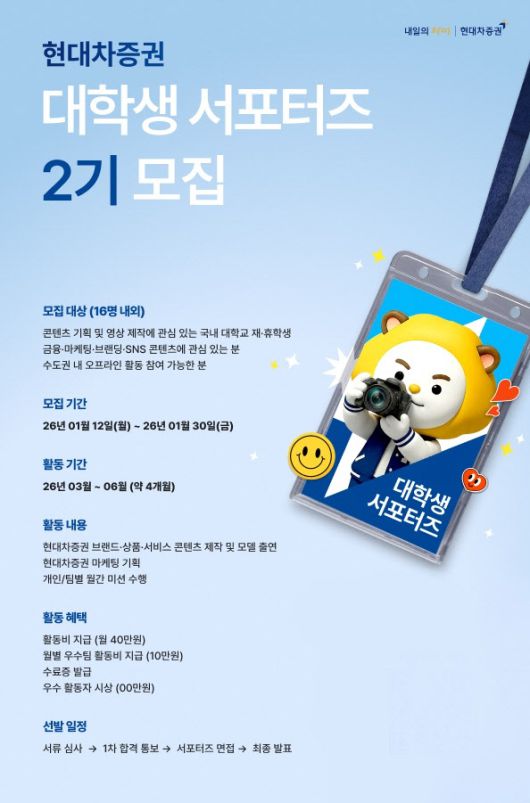 지원 접수는 1월 12일부터 1월 30일까지이며, 선발된 서포터즈는 3월부터 6월까지 약 4개월 동안 현대차증권의 브랜드 홍보와 온·오프라인 콘텐츠 제작에 참여하게 된다. 활동은 개인 및 팀 단위로 진행되며, 발대식, 워크숍, 해단식 등 다양한 오프라인 프로그램도 함께 운영된다.