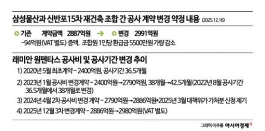 19일 신반포15차 대책위원회 등에 따르면 삼성물산은 지난달 16일 신반포15차 조합과 공사계약 변경 약정서를 체결했다. 약정서는 조합이 삼성물산에 지급해야 할 공사금액을 기존 2887억원(부가세 별도)에서 2981억원으로 94억원가량 증액하는 내용을 담고 있다.