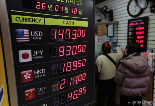 (서울=뉴스1) 오대일 기자 = 외환 당국의 개입에도 불구하고 원·달러 환율이 1480원선에 육박하는 등 고환율·고물가의 이중고가 계속되는 가운데 18일 오후 서울 중구 명동거리의 환전소에서 외국인들이 환전을 하고 있다. 2026.1.18/뉴스1 Copyright (C) 뉴스1. All rights reserved. 무단 전재 및 재배포, AI학습 이용 금지. /사진=(서울=뉴스1) 오대일 기자 |