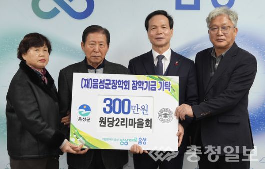 충북 음성군 감곡면 원당2리 마을회(이장 김익환)는 19일 음성군청을 방문해 지역 인재육성에 힘을 보태기 위해 (재)음성군장학회에 장학금 300만원을 기탁했다. /음성=김록현기자