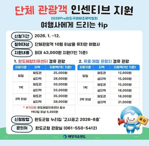 군은 단체 관광객을 유치해 관내 음식점, 숙박업소, 완도해양치유센터, 특산품 판매장 등을 이용할 경우 지원 조건 충족 여부에 따라 인센티브를 지원한다.