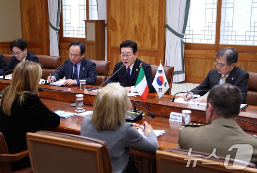 (서울=뉴스1) 이재명 기자 = 이재명 대통령이 19일 청와대에서 열린 조르자 멜로니 이탈리아 총리와의 확대회담에서 발언하고 있다. 2026.1.19/뉴스12expulsion@news1.krCopyright ⓒ 뉴스1. All rights reserved. 무단 전재 및 재배포, AI학습 이용 금지.