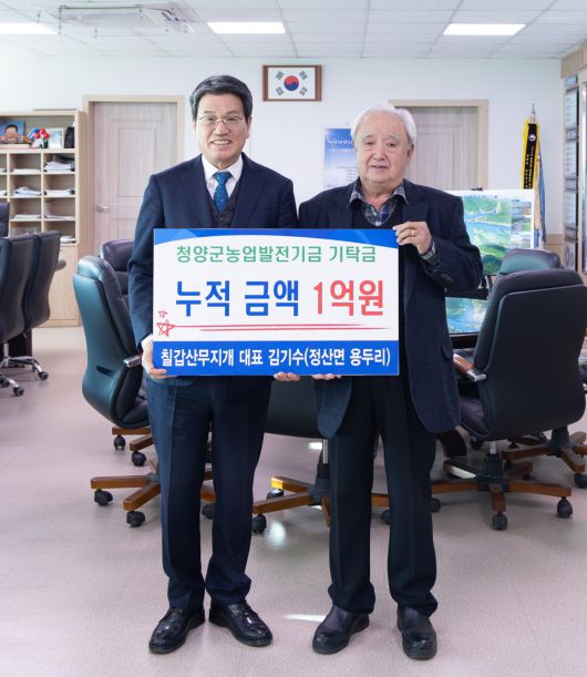 충남 청양군은 정산면 용두리 소재 '칠갑산무지개'의 김기수 대표가 군청을 방문해 농업발전기금 1,000만 원을 기탁하면서 올해로 마침내 누적 기탁금 1억 원을 달성했다고 밝혔다.
