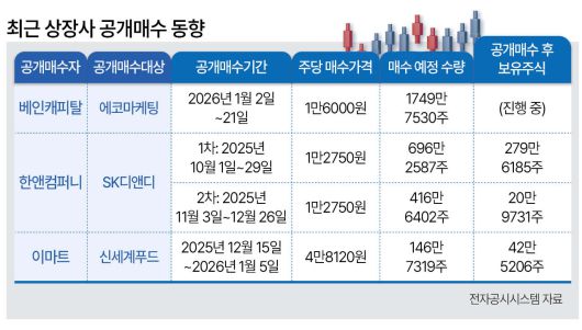 프리미엄을 제시하고도 ‘헐값 논란’에 발목이 잡힌 건 에코마케팅뿐만이 아니다. 앞서 이마트는 신세계푸드 공개매수에 20%의 할증을 붙였으나 PBR(주가순자산비율) 0.59배 수준이라는 저평가 논란 속에 응모율이 저조했다.