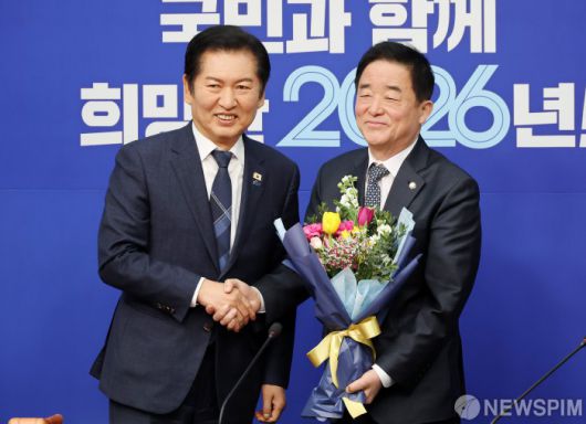 정청래 더불어민주당 대표가 지난 12일 오전 서울 여의도 국회에서 열린 최고위원회의에서 강득구 신임 최고위원에게 축하 꽃다발을 전달한 뒤 기념촬영을 하고 있다. [사진=뉴스핌 DB] |