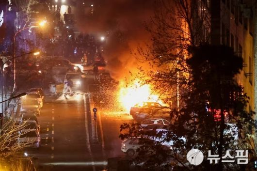 지난 8일(현지 시간) 이란 수도 테헤란에서 발생한 반정부 시위 현장에서 길거리에 주차된 차량들이 불타고 있다. [사진=로이터 뉴스핌] |