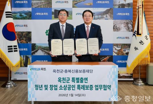 황규철 옥천군수(오른쪽)와 김창순 충북신용보증재단 이사장(왼쪽)이 특례보증 업무협약을 체결하고 기념촬영하고 있다. |