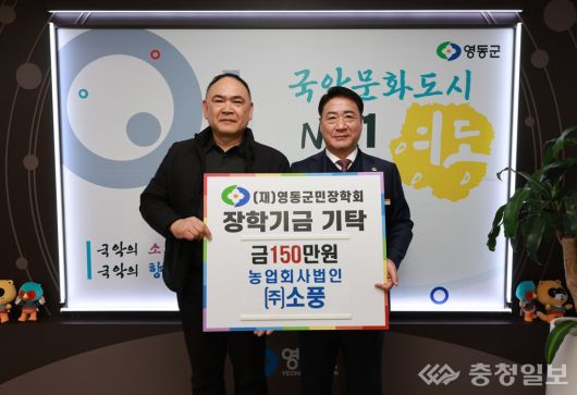 ㈜소풍 농업회사법인이 19일 영동군청을 방문해 (재)영동군민장학회에 장학금 150만원을 기탁했다.