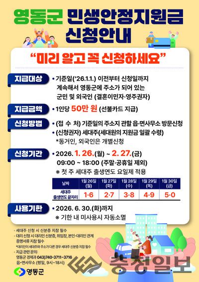 충북 영동군은 오는 26일부터 전 군민을 대상으로 1인당 50만원의 '민생안정지원금'을 지급한다고 밝혔다.