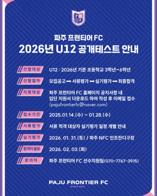 [인터풋볼=송건 기자] 2026 K리그2 진출이 최종 승인된 파주 프런티어 FC가 구단의 미래를 책임질 유망주 발굴을 위해 2026년 U12 공개테스트를 개최한다.