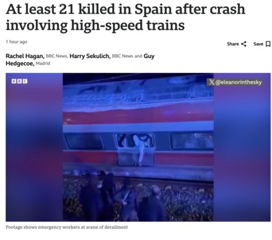 BBC 등 외신에 따르면, 18일(현지 시각) 스페인 남부 코르도바 인근 아다무스(Adamuz) 지역에서 고속열차 두 대가 충돌해 탈선하는 사고가 발생했다. 이 사고로 현재까지 최소 21명이 사망하고 100명 이상의 승객이 크고 작은 부상을 입은 것으로 집계됐다.