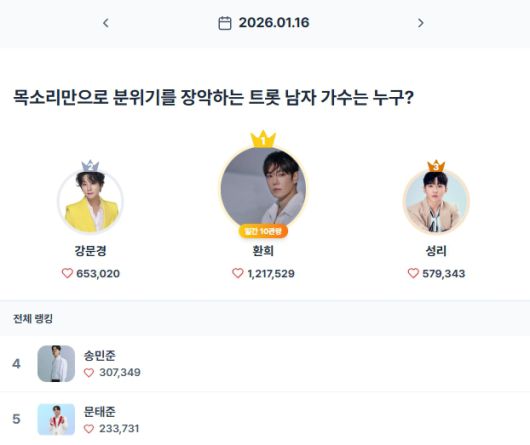2위는 653,020표를 받은 강문경이 차지했다. 특유의 감성적인 보이스로 팬들의 꾸준한 지지를 받고 있는 그는 최근 다양한 공연 무대와 방송을 통해 활발한 활동을 펼치고 있다. 팬들은 "강문경의 목소리는 겨울 밤을 따뜻하게 감싸준다"며 응원을 이어가고 있다.