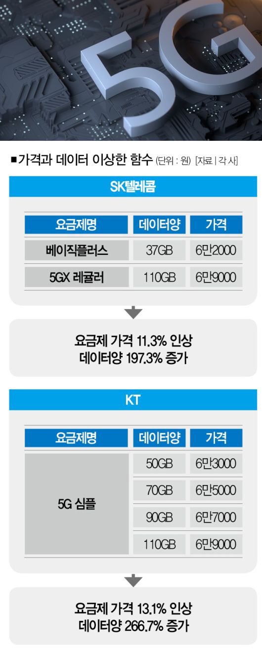 SK텔레콤 역시 다르지 않습니다. 데이터 37GB를 지급하는 '베이직 플러스(6만2000원)'와 110GB를 제공하는 5GX 레귤러(6만9000원)의 가격 차이는 7000원입니다. 5GX 레귤러의 데이터 제공량이 3배나 많지만 가격차는 10%밖에 나지 않습니다. 데이터를 볼모로 소비자가 더 비싼 요금제를 쓸 수밖에 없도록 가격 테이블을 설정한 겁니다.