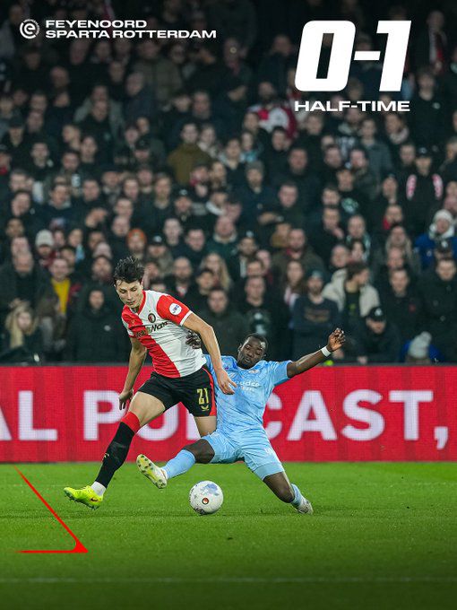 결국 전반 40분 스파르타가 먼저 선제골을 기록했다. 키톨라노가 토비아스 로리츠센과 패스를 주고받은 뒤 페널티 박스 외곽에서 오른발 슈팅을 시도했고, 공은 골문 상단 구석으로 들어갔다. 이 골로 페예노르트는 0-1로 뒤진 채 전반을 마쳤다.