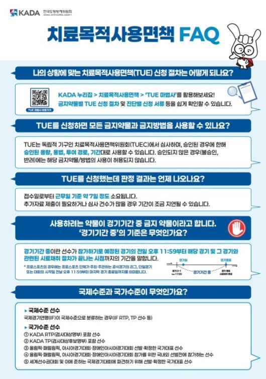 KADA는 도핑방지 규정상 금지된 약물이나 방법이라 하더라도 질병이나 부상 치료를 위해 의학적으로 불가피한 경우, 예외적으로 사용을 허용하는 TUE 제도를 상시 운영하고 있다고 밝혔다.