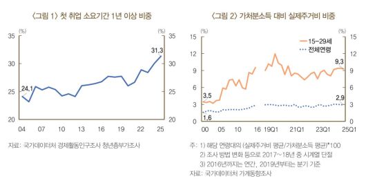 이재호 한은 조사국 거시분석팀 차장은 “청년층의 노동시장 진입 지연과 주거비 부담은 단기적인 어려움에 그치지 않고 생애 전반의 소득과 자산 형성에 지속적인 부정적 영향을 미치는 구조적 문제”라며 “구직 지연은 고용 안정성과 임금에 상흔효과로 남고 주거비 부담 증가는 교육과 훈련 투자 여력을 제약해 장기 성장 잠재력까지 약화할 수 있다”고 말했다.