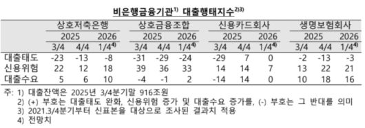 비은행금융기관은 대출태도가 전반적으로 강화 기조를 유지하되 강도는 일부 완화될 전망이다. 업권별 대출태도지수는 저축은행 -8, 상호금융 -24, 신용카드회사 0, 생명보험회사 -3으로 집계됐다. 비은행권 신용위험은 업황 부진과 차주의 상환능력 저하 우려로 전 업권에서 경계감이 지속될 것으로 제시됐다.