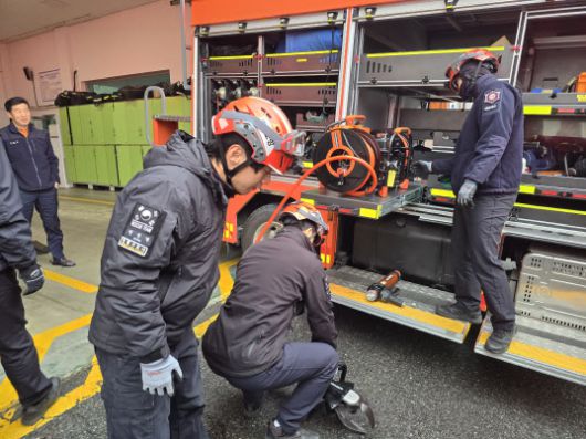 펌프차구조대가 구조 장비를 점검하고 있다.(사진=소방청) |