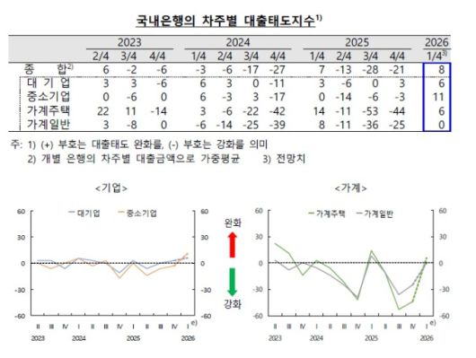 [서울=뉴스핌] 전미옥 기자 = 국내 은행들이 2026년 1분기 들어 대출 문턱을 다소 낮출 것으로 전망됐다. 반면 저축은행·상호금융 등 비은행권은 여전히 보수적인 대출 기조를 유지할 것으로 나타났다.