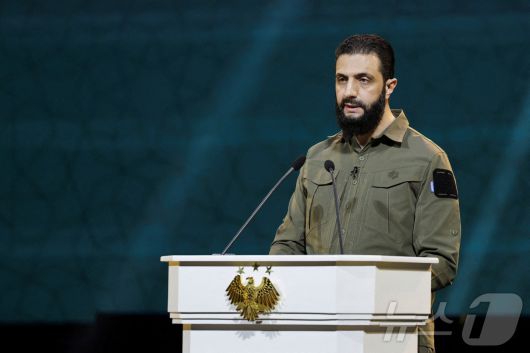 아메드 알샤라 시리아 임시대통령이 지난해 12월 8일 다마스쿠스에서 바샤르 알 아사드 정권의 축출 1주년을 기념해 연설하고 있다. 2025.12.8 ⓒ 로이터=뉴스1 ⓒ News1 강민경 기자 |