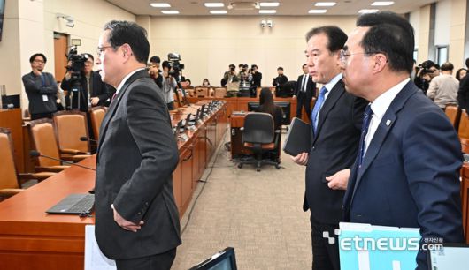 19일 서울 여의도 국회 재정경제기획위원회에서 열린 전체회의에서 박수영 국민의힘 간사와 정태호 더불어민주당 간사가 정회되자 회의장을 나서고 있다. 이날 재정기획위에서는 이혜훈 기획예산처 장관 후보자 인사청문회가 열리기로 예정돼 있었지만, 청문 자료 제출을 둘러싼 여야 갈등으로 전체회의는 개회한 채 인사청문회 상정이 되지 않아 청문회가 열리지 못하고 있다.