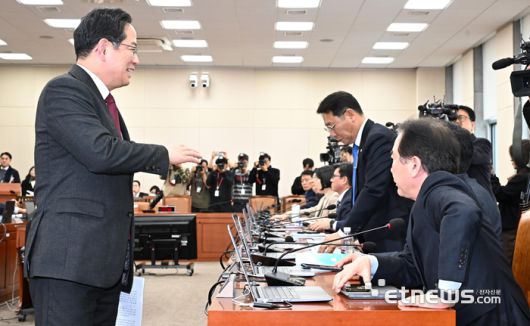 19일 서울 여의도 국회 재정경제기획위원회에서 열린 전체회의에서 박수영 국민의힘 간사(왼쪽)와 정태호 더불어민주당 간사를 비롯한 여당 의원들과 대화하고 있다. 이날 재정기획위에서는 이혜훈 기획예산처 장관 후보자 인사청문회가 열리기로 예정돼 있었지만, 청문 자료 제출을 둘러싼 여야 갈등으로 전체회의는 개회한 채 인사청문회 상정이 되지 않아 청문회가 열리지 못하고 있다.