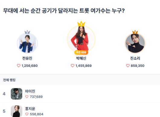 진소리는 859,350표, 마이진은 737,689표, 홍지윤은 556,804표를 획득하며 각각 3, 4, 5위를 기록했다.