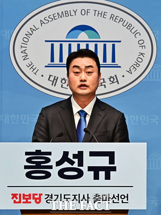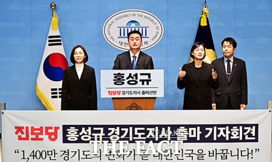 [더팩트ㅣ국회=배정한 기자] 홍성규 진보당 대변인이 19일 오전 서울 여의도 국회 소통관에서 기자회견을 열고 경기도지사 출마선언을 하고 있다. 왼쪽부터 김재연 진보당 상임대표, 홍 대변인, 수화통역사, 윤종오 진보당 원내대표.